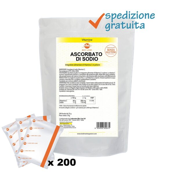 Ascorbato di Sodio - Integratore in polvere in bustine di vitamina C - Utile per l'azione antiossidante - Sostanza pura senza eccipienti - Big - Busta da 5 Kg (200 bustine da 25 g) con misurino31/07/2027