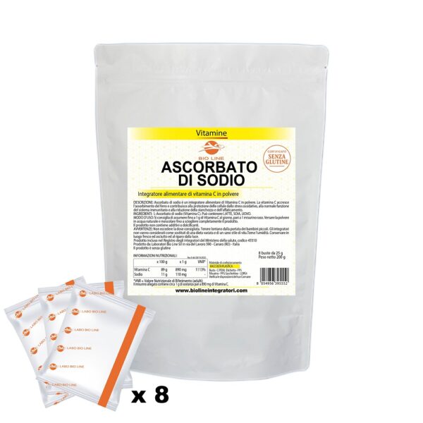 Ascorbato di Sodio - Integratore in polvere in bustine di vitamina C - Utile per l'azione antiossidante - Sostanza pura senza eccipienti - Busta da 200 g (8 bustine da 25 Kg) con misurino31/07/2027