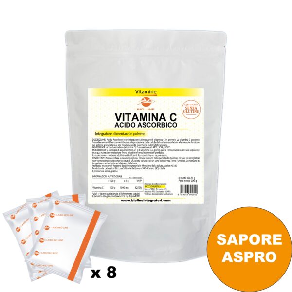 Acido Ascorbico - Integratore in polvere in bustine di vitamina C ad azione antiossidante - Sostanza pura senza eccipienti - Busta da 200 g (8 bustine da 25 Kg) con misurino31/07/2027