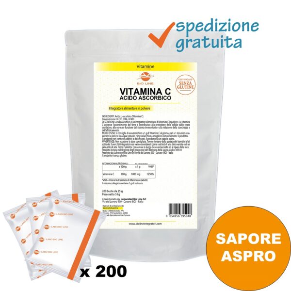 Acido Ascorbico - Integratore in polvere in bustine di vitamina C ad azione antiossidante - Sostanza pura senza eccipienti - Big - Busta da 5 Kg (200 bustine da 25 g) con misurino31/07/2027