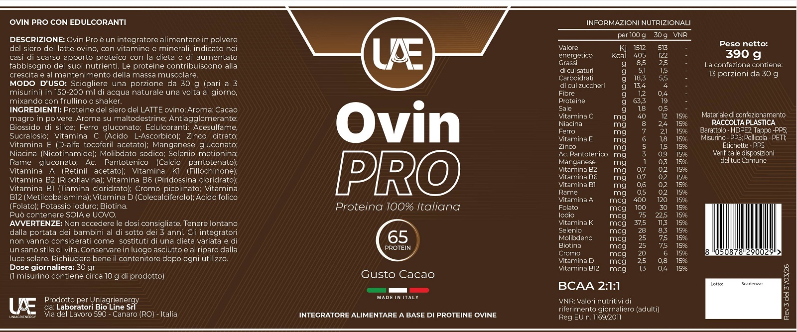 | Ovin Pro - Integratore alimentare in polvere di proteine del siero del latte ovino - Con Vitamine e Minerali - Barattolo da 390 g con misurino - Gusto Cacao | 30/11/2027 |