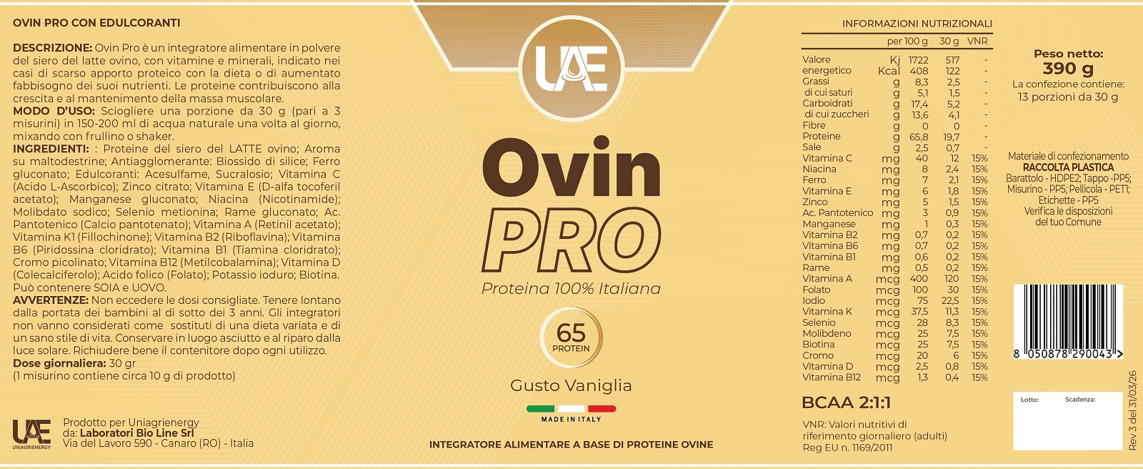 | Ovin Pro - Integratore alimentare in polvere di proteine del siero del latte ovino - Con Vitamine e Minerali - Barattolo da 390 g con misurino - Gusto Vaniglia | 30/11/2027 |