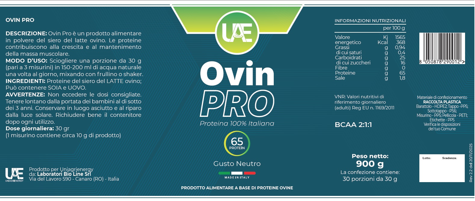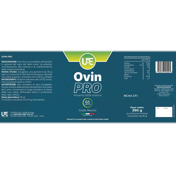 OVIN PRO è un prodotto alimentare ad alto contenuto di proteine (65%) che contribuiscono alla crescita e al mantenimento della massa muscolare. Inoltre la presenza naturale di BCAA nell’ottimale rapporto di Leucina, Valina e Isoleucina pari a 2:1:1, contribuisce a rendere OVIN PRO un valido alleato nella nutrizione sportiva quotidiana.